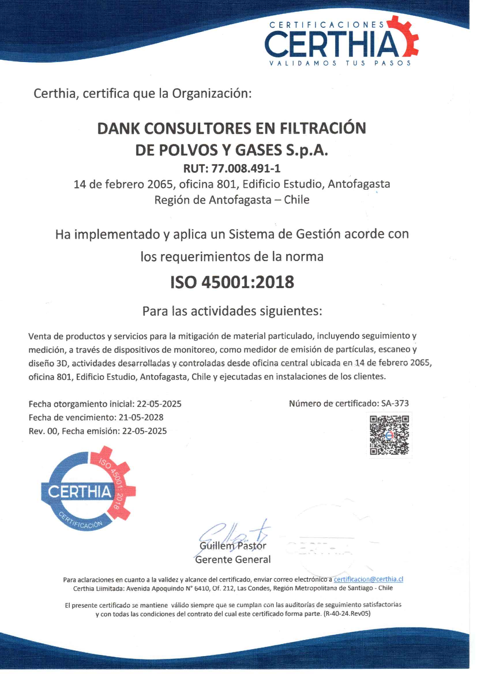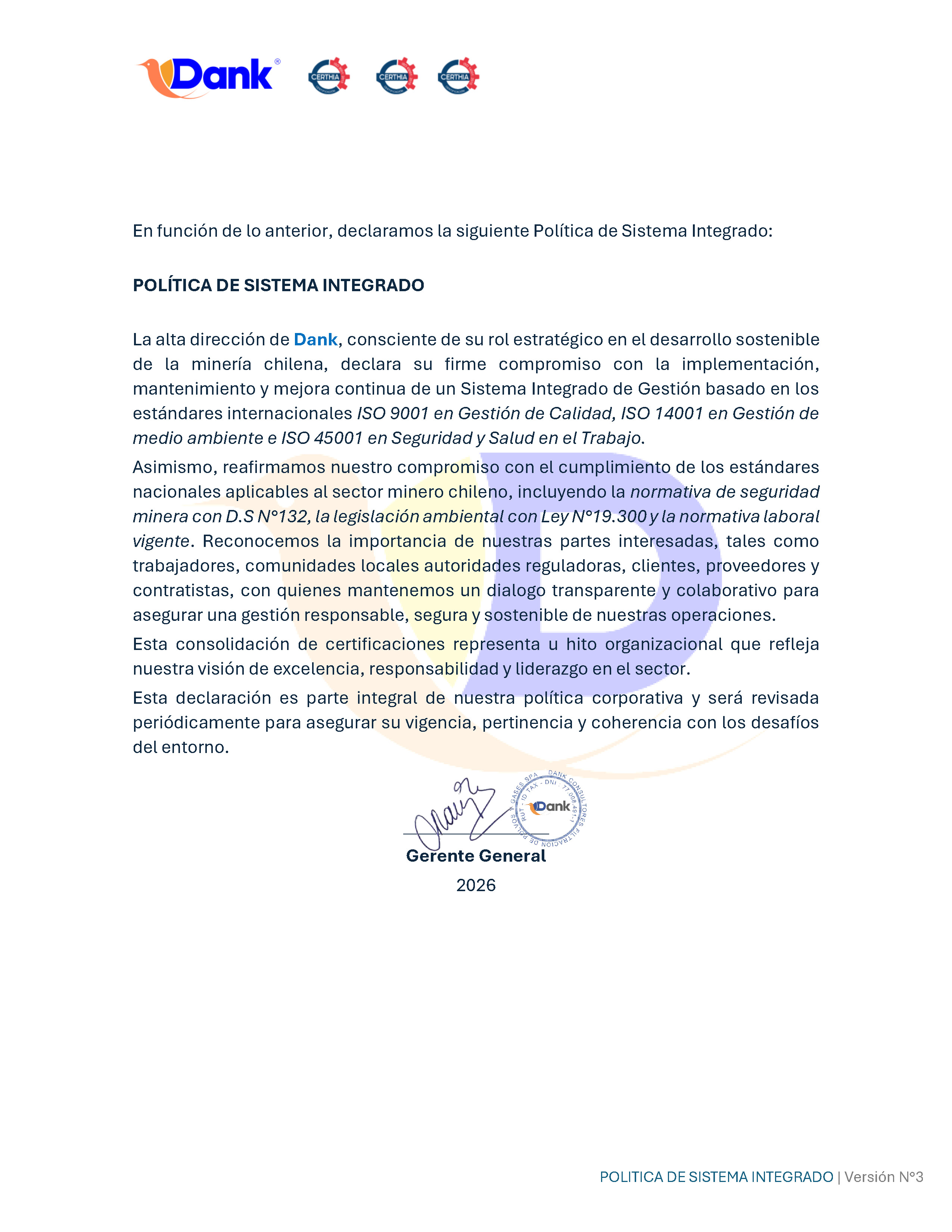 En Dank hemos consolidado nuestro liderazgo mediante la implementación exitosa de un Sistema de Gestión certificado por Certhia. Contamos con el respaldo de los estándares internacionales ISO 9001:2015, ISO 14001:2015 e ISO 45001:2018, certificaciones vigentes hasta mayo de 2028 que avalan nuestra capacidad operativa y organizacional.
