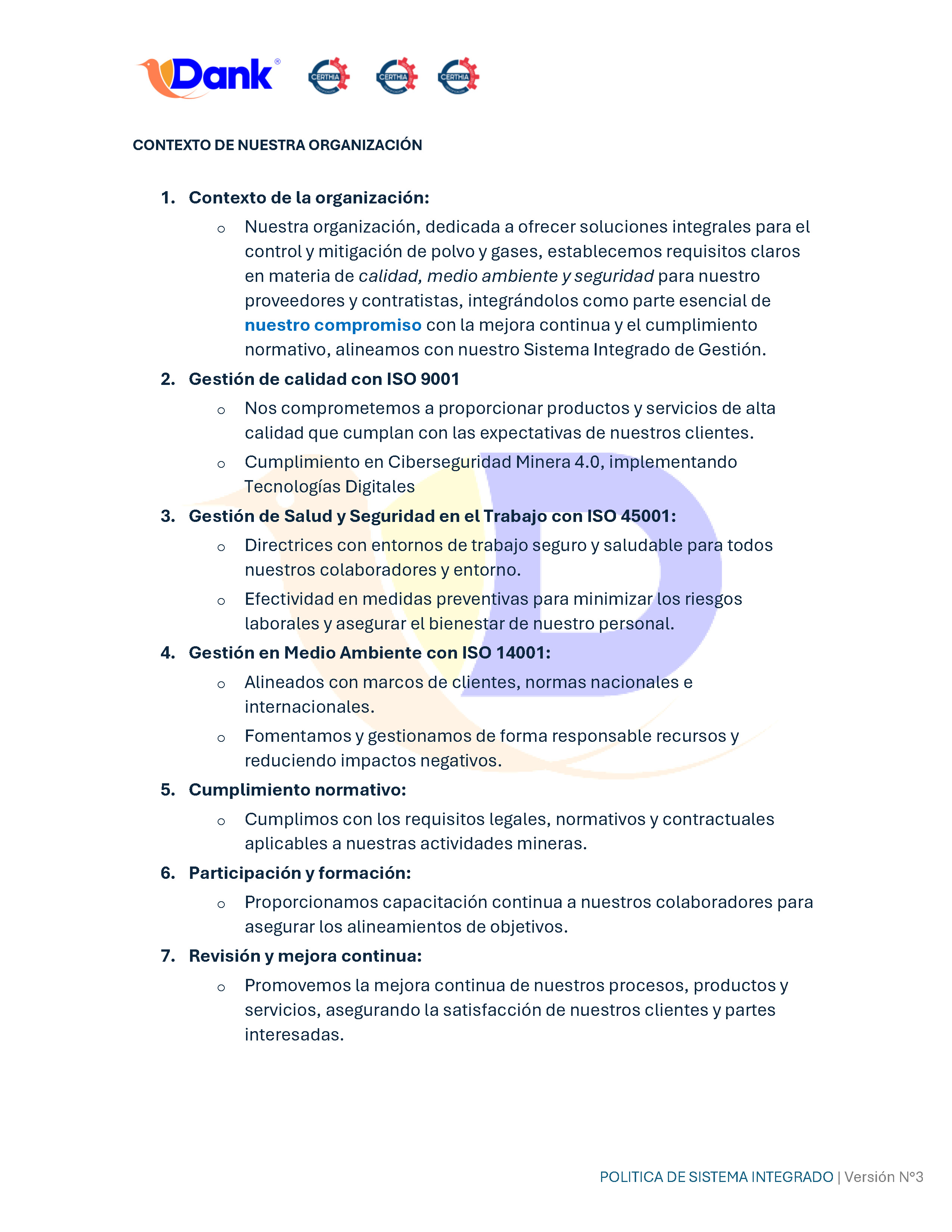 En Dank, nos dedicamos a ofrecer soluciones integrales para el control de polvo y gases, fundamentando nuestra gestión en un compromiso inquebrantable con la mejora continua. Operamos bajo los más altos estándares internacionales, integrando las normas ISO 9001, 14001 y 45001 para garantizar procesos de excelencia y la plena satisfacción de nuestros clientes a través de productos de alta calidad.